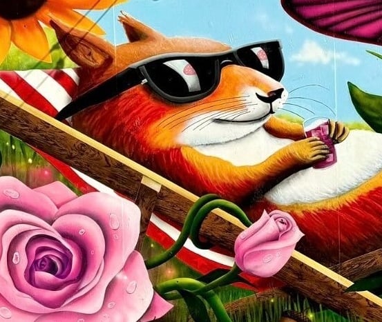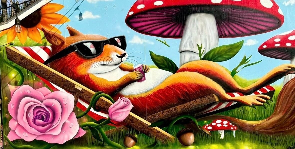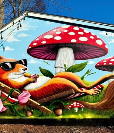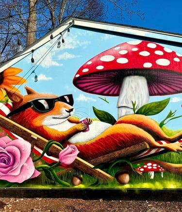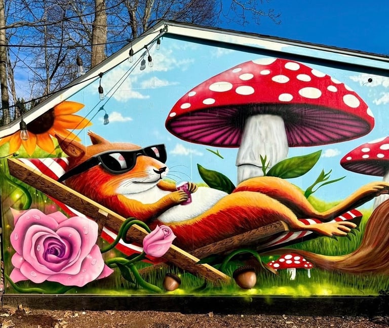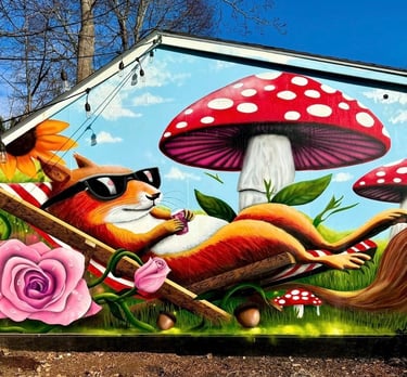 The mural was painted on the side of a shed in a friend’s backyard. Inspired by his love of squirrels, the piece captures a playful scene of a squirrel relaxing in the sun, surrounded by flowers and mushrooms. The artwork was created to bring color, warmth, and a touch of joy to the space.