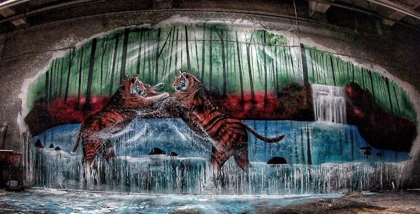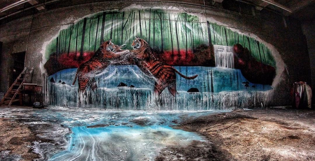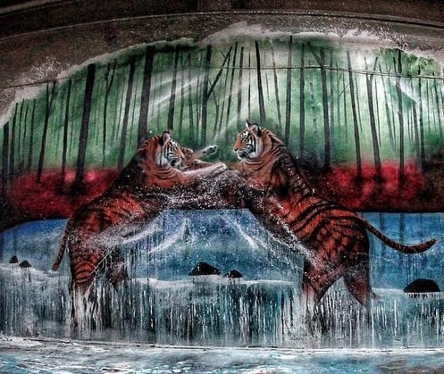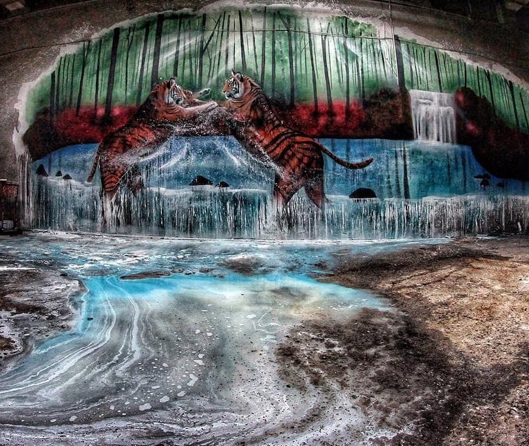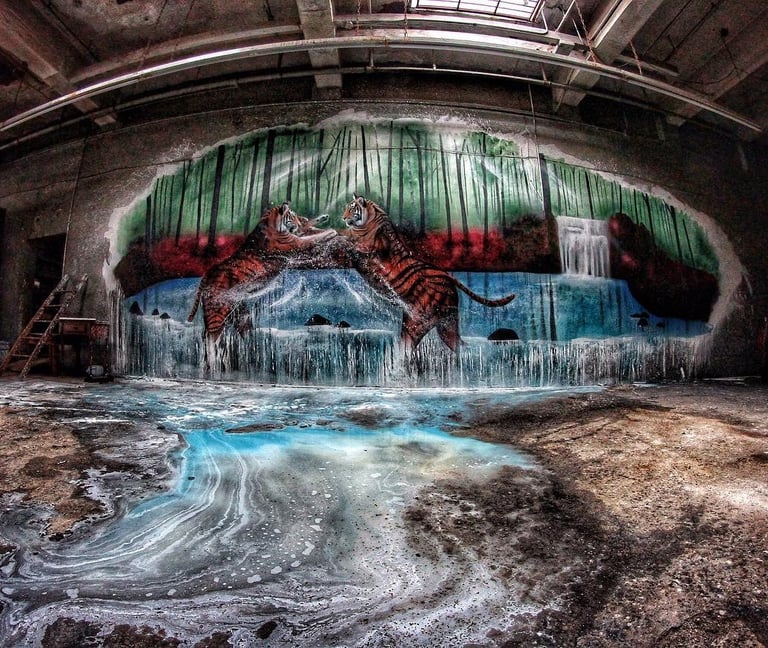 Painted in an abandoned warehouse in the middle of winter, this mural captures two tigers locked in motion—a reflection of strength, survival, and instinct. With no power or heat, only cold air and silence, the process itself became part of the piece. Every layer of spray paint and acrylic carries the atmosphere of that moment: raw, unfiltered, and real.