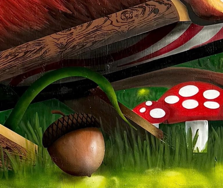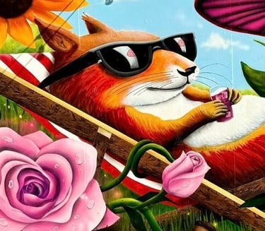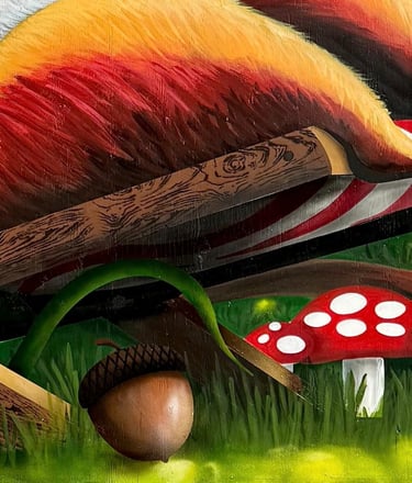 I painted this mural on the side of a shed in my friend’s backyard. He loved squirrels, so I wanted to create something fun and full of life. It shows a squirrel relaxing in the sun, surrounded by flowers and mushrooms. The goal was to make something bright that would bring a little happiness to the space.